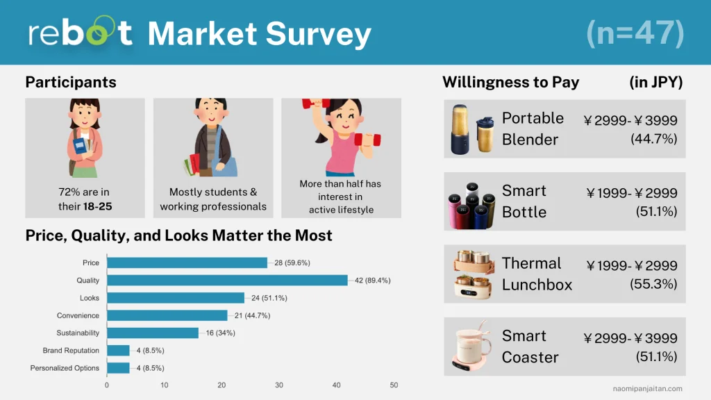 The willingness to pay indicates that most respondents are comfortable spending Â¥1,999 – Â¥3,999 JPY, depending on the product type.