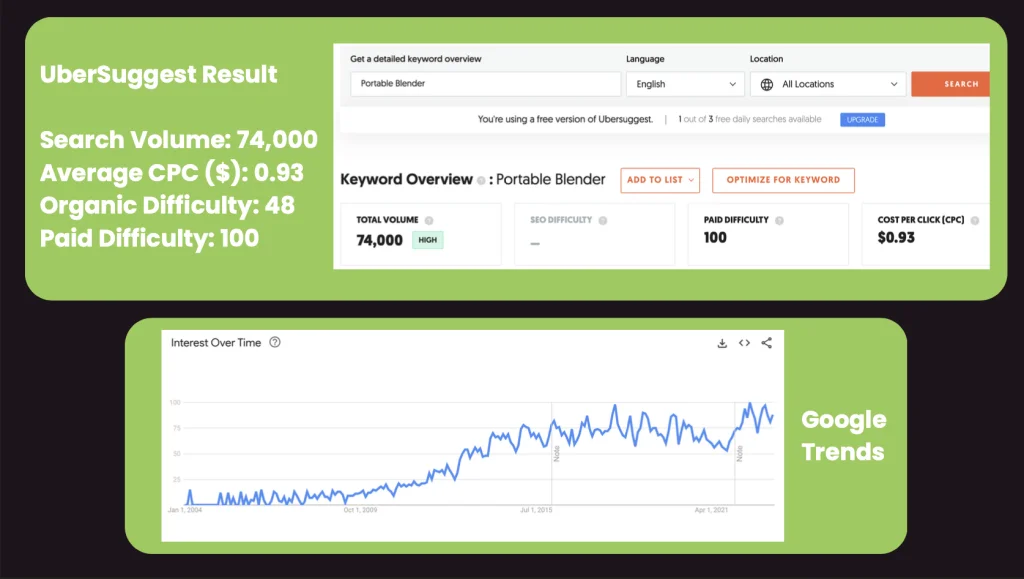 We selected the portable blender as our star product due to its high market demand (74,000 monthly searches), affordability, and strong fit with our target audience’s need for mobility and wellness. It also positions us for future expansion into related portable kitchen and fitness products.