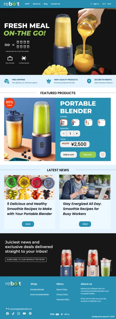 The result was Reboot, a modern e-commerce dedicated to empowering health-conscious, on-the-go users. Our flagship product, a portable blender, is part of a handpicked range of portable gadgets designed to support healthier lifestyles.