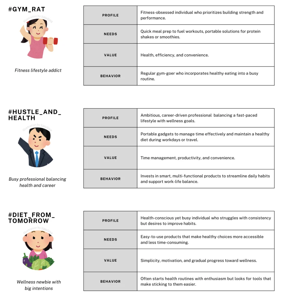 Based on the previous market survey, we developed target market personas to shape our brand identity and inform user experience design.