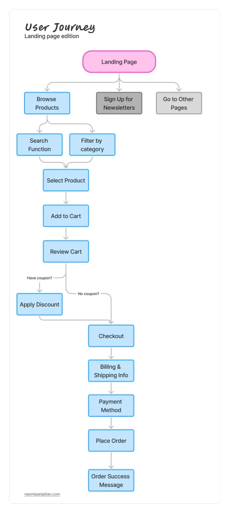 Designed detailed user flows covering browsing, product filtering, and checkout processes.
